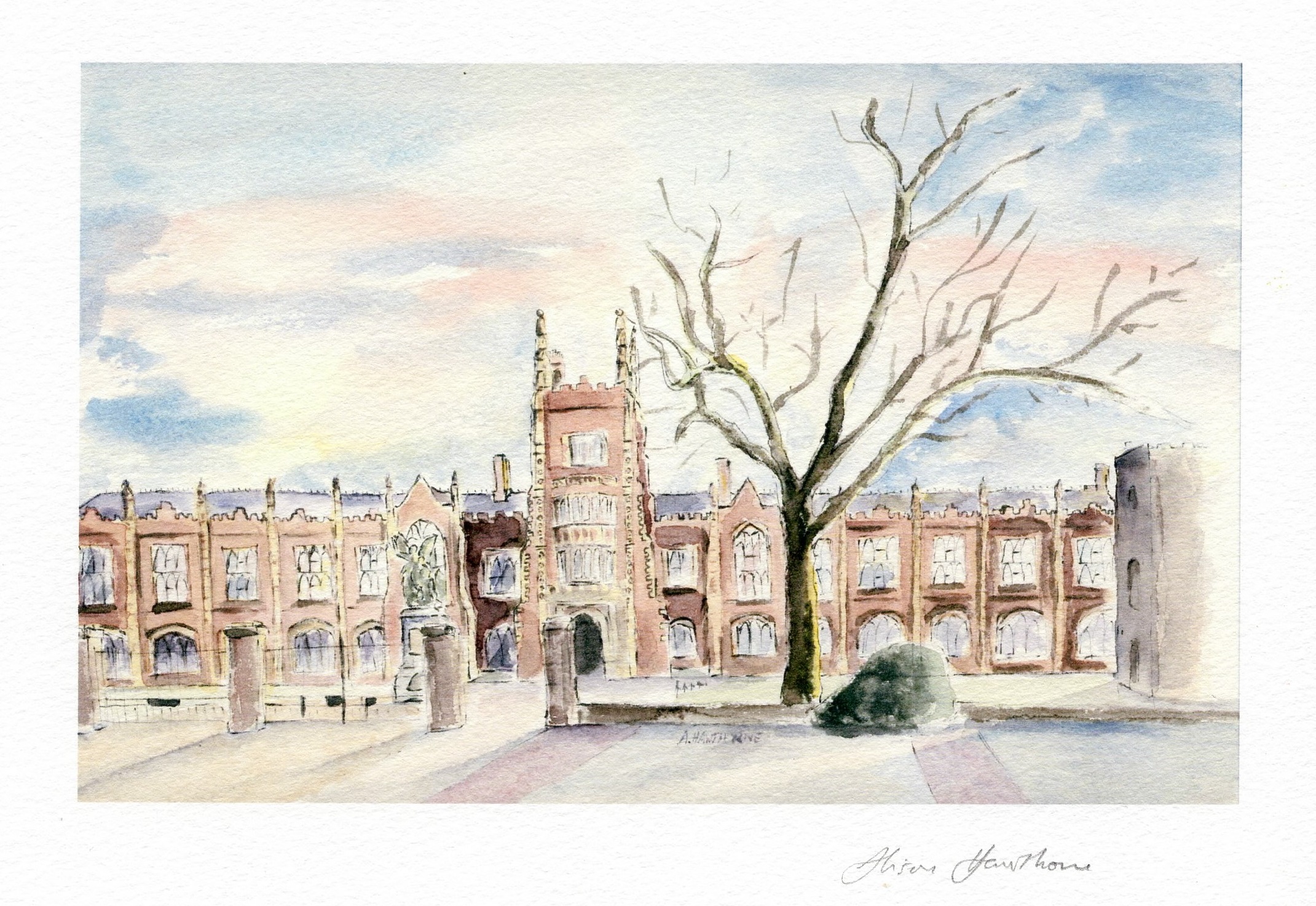 'QUEENS UNIVERSITY OF BELFAST' signed print16cm by 10.1 cm image on quality watercolour digital A5 paper. |